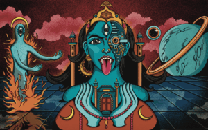 This piece visualizes the intersection of faith, technology and transformation. The central figure, part deity and part machine, guards a portal—an invitation to step into new dimensions of thought and imagination. Created for Tasavvurnama’s inaugural issue, it channels South Asian spiritual motifs through a sci-fi lens, suggesting that divinity might evolve with us as we cross into uncharted futures.